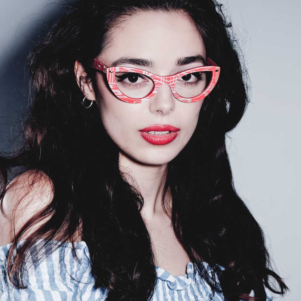 Handcrafted from rich red acetate featuring unique Art Deco print design, the sculpted browline creates strength and clarity. Gold detailing and polished metal trim enhance the frame with subtle opulence, never overpowering its structure.