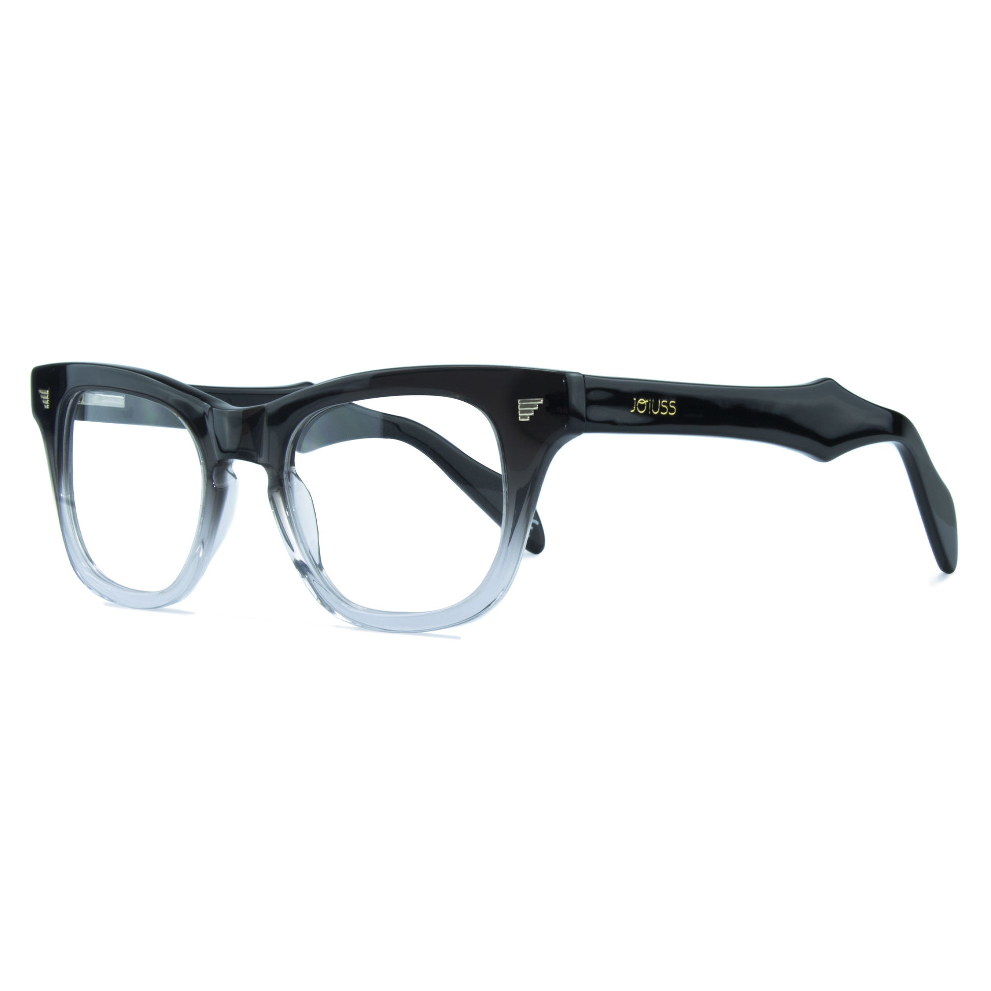 Features: Flexible sprung side arms, black and clear two-tone colours, inlaid gold foil JOIUSS™ brand label to both side arms.